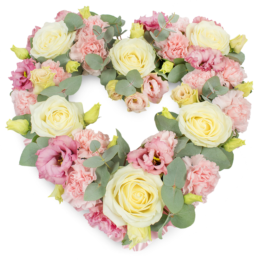Express your heartfelt emotions with our Elegant Open Heart Bouquet, meticulously crafted to symbolize love and remembrance. This stunning arrangement features elegant white roses, vibrant pink carnations, delicate pink lisianthus, and lush eucalyptus leaves, creating a harmonious blend of colors and textures.